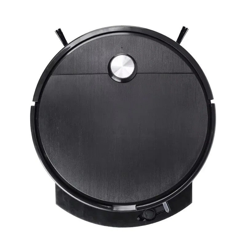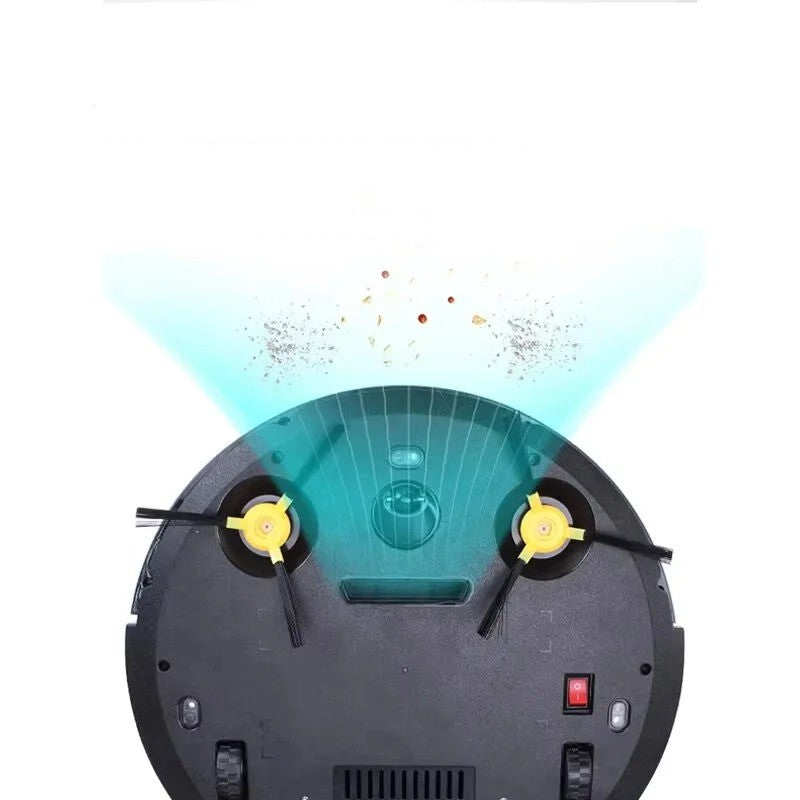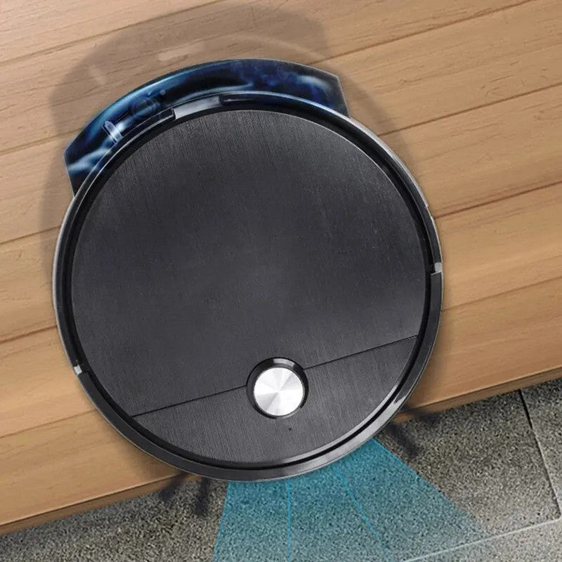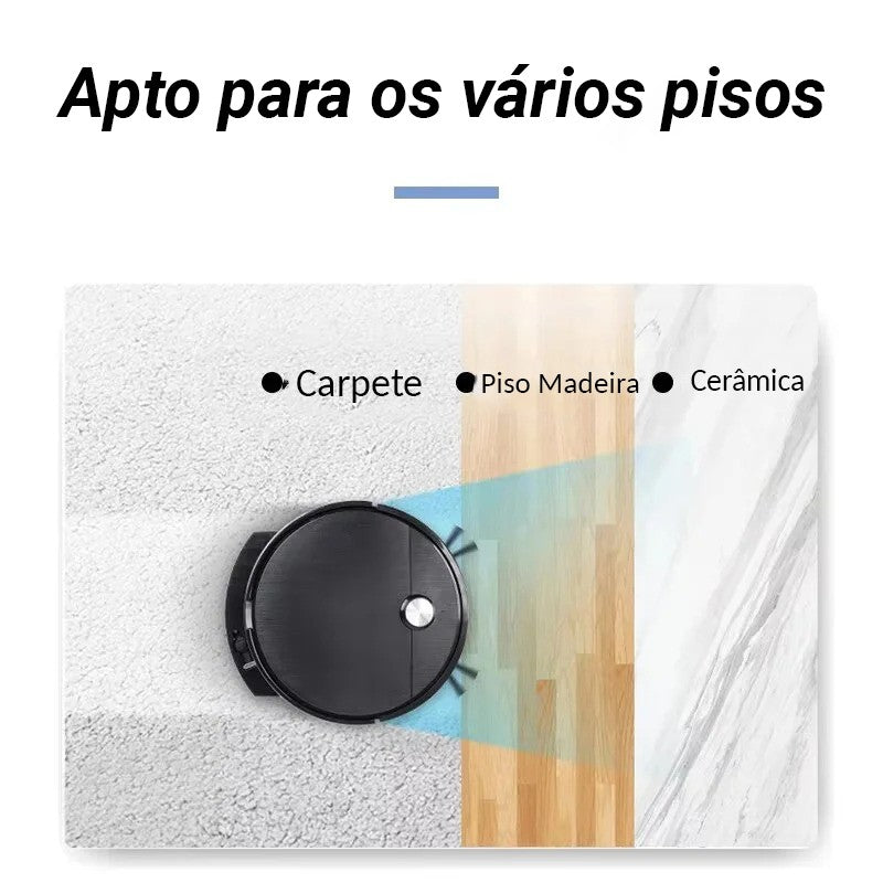 Aspirador robot inteligente 3 em 1 com função de aspiração, lavagem e mopa. Conta com sensores anti-queda e anti-colisão, reservatório de água integrado e comando remoto. Ideal para madeira, mármore, azulejo e tapetes finos. Design ultrafino para limpeza eficiente sob móveis. Dimensões: 37 x 32 x 5,5 cm.